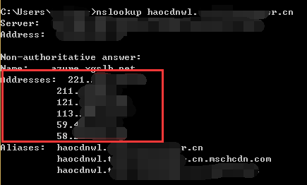 - 输入 nslookup 域名,获取“地址”对应的 IP 地址。 例如,如果加速域名为 www.cdntest.com,则在命令窗口中输入 nslookup www.cdntest.com,然后选择 Enter。