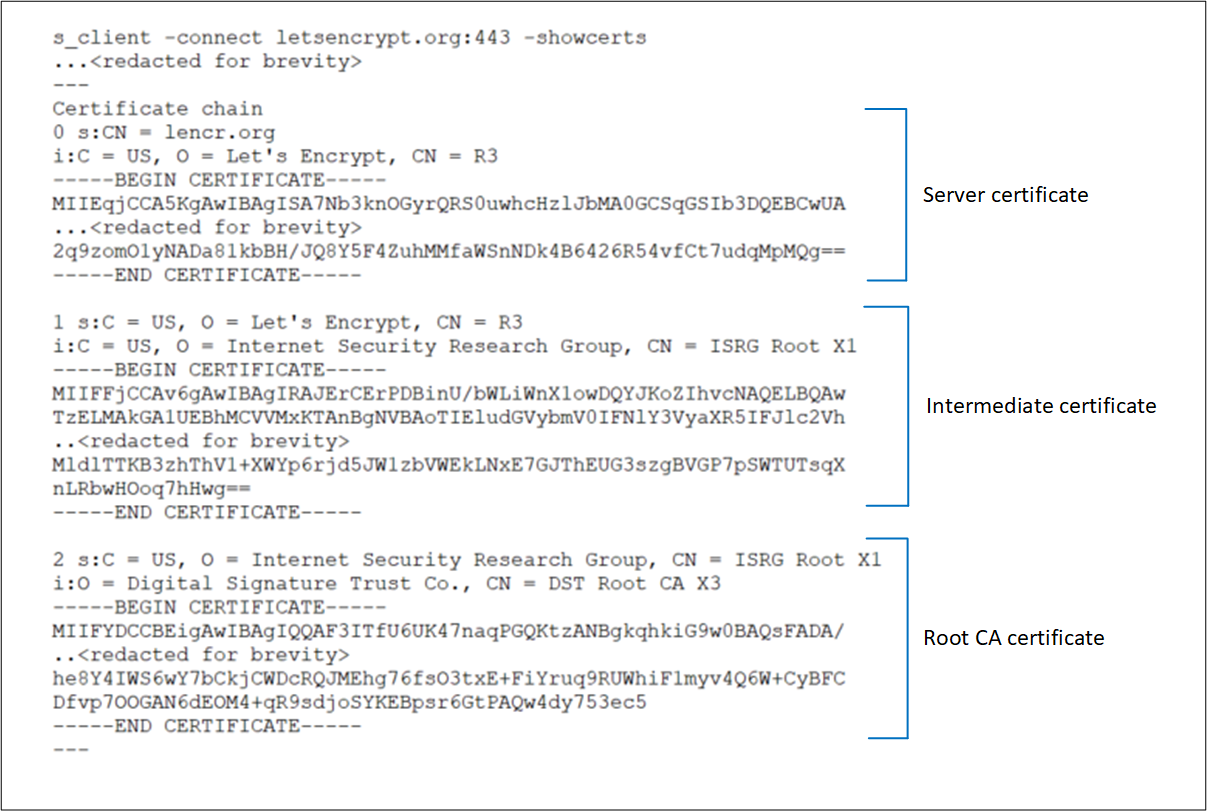 Given is an example of a Server certificate installation along with its Intermediate and Root CA certificates, denoted as depths (0, 1, 2, and so on) in OpenSSL. You can verify the same for your backend server’s certificate using the following OpenSSL commands.