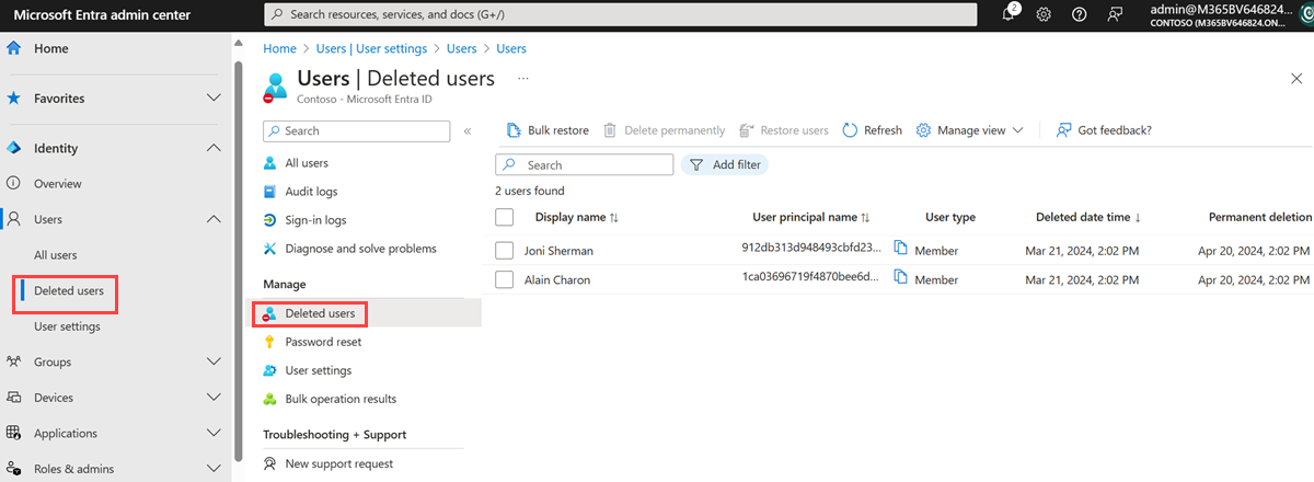 You can view your restorable users, restore a deleted user, or permanently delete a user using the Microsoft Entra admin center.