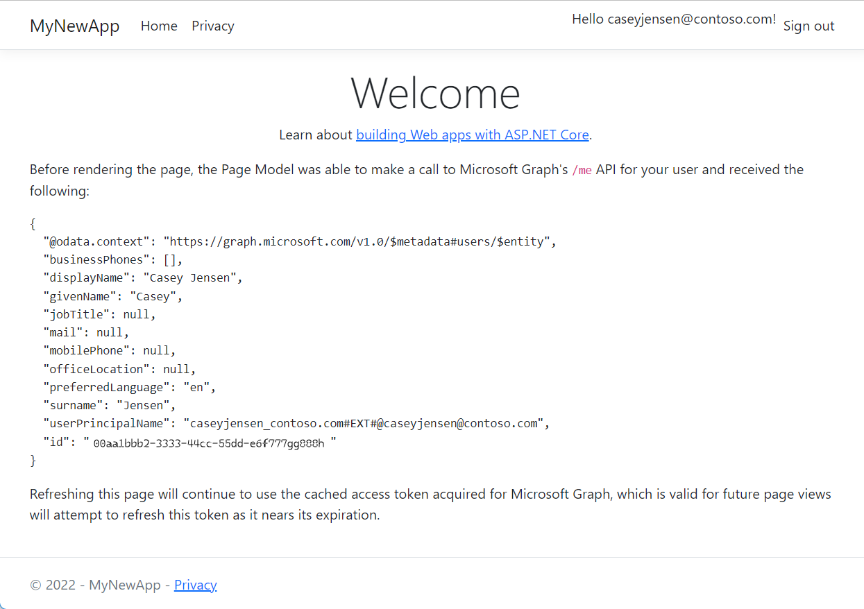 The application requests permission to maintain access to data you have given it access to, and to sign you in and read your profile. Select Accept. The following screenshot appears. It indicates that you're signed-in to the application and are viewing your profile details from the Microsoft Graph API.