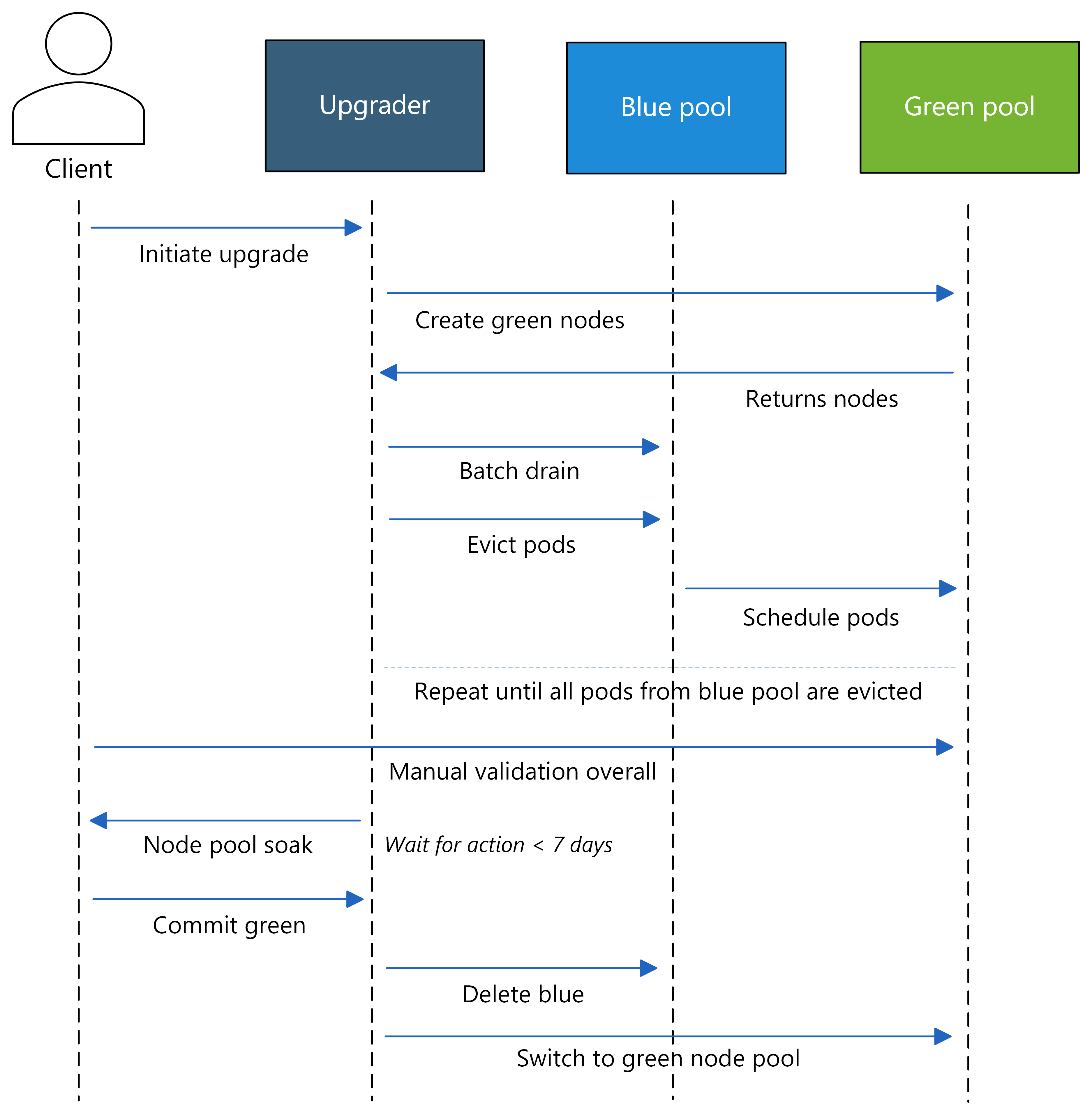 Keep in mind that blue-green upgrades require double the node capacity during the upgrade process, which can lead to increased costs and resource requirements.