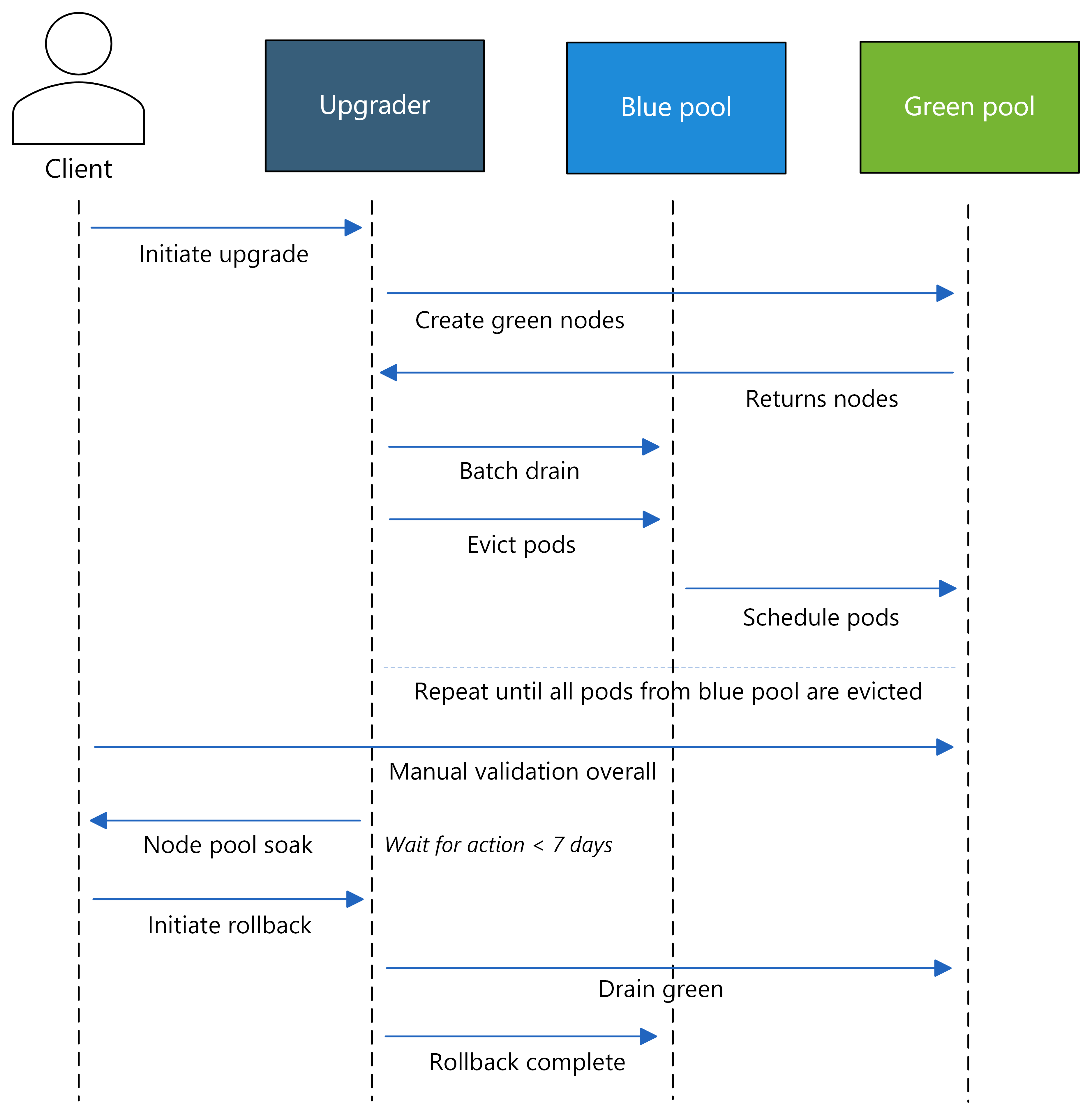 az aks nodepool upgradecommand with the--kubernetes-versionparameter set to your desired version. You can start a blue-green upgrade for a node pool already using the blue-green strategy or for a node pool not yet configured with blue-green strategy. The following examples demonstrate both scenarios:# Start a blue-green upgrade for an existing node pool already using blue-green strategy az aks nodepool upgrade \ --name myNodePool \ --cluster-name myAKSCluster \ --resource-group myResourceGroup \ --kubernetes-version <kubernetes-version> # Start a blue-green upgrade for an existing node pool not yet using blue-green strategy az aks nodepool upgrade \ --name myNodePool \ --cluster-name myAKSCluster \ --resource-group myResourceGroup \ --kubernetes-version <kubernetes-version> \ --upgrade-strategy bluegreen