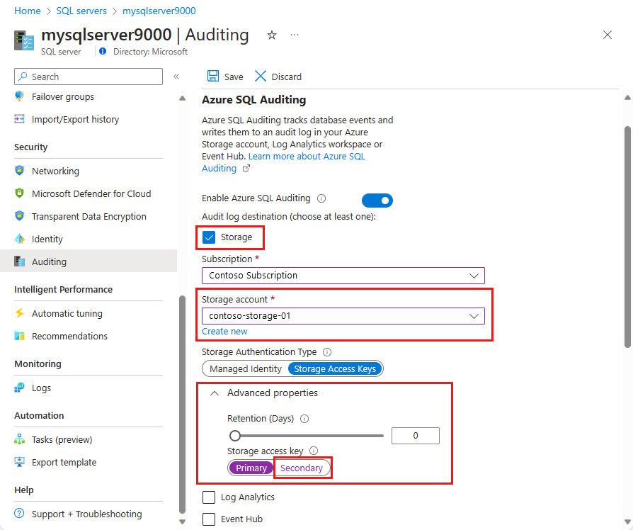Open Advanced properties under Storage. In the Storage Access Key section, select Secondary. Then select Save at the top of the auditing configuration page.