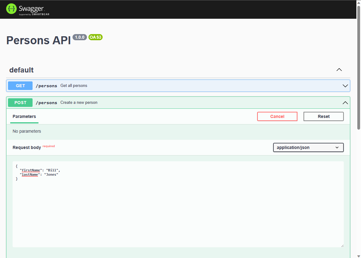 openApiSchema.ymlfile and add the following code so the OpenAPI UI explorer knows what APIs and models to display:openapi: 3.0.0 info: version: 1.0.0 title: Persons API paths: /persons: get: summary: Get all persons responses: '200': description: OK content: application/json: schema: type: array items: $ref: '#/components/schemas/Person' post: summary: Create a new person requestBody: required: true content: application/json: schema: $ref: '#/components/schemas/Person' responses: '201': description: Created content: application/json: schema: $ref: '#/components/schemas/Person' /persons/{id}: parameters: - name: id in: path required: true schema: type: integer get: summary: Get a person by ID responses: '200': description: OK content: application/json: schema: $ref: '#/components/schemas/Person' '404': description: Person not found put: summary: Update a person by ID requestBody: required: true content: application/json: schema: $ref: '#/components/schemas/Person' responses: '200': description: OK content: application/json: schema: $ref: '#/components/schemas/Person' '404': description: Person not found delete: summary: Delete a person by ID responses: '204': description: No Content '404': description: Person not found components: schemas: Person: type: object properties: id: type: integer readOnly: true firstName: type: string lastName: type: string