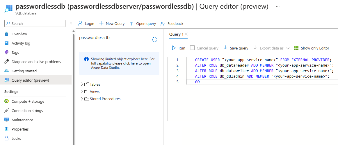 <your-app-service-name>with your App Service resource's name.CREATE USER "<your-app-service-name>" FROM EXTERNAL PROVIDER; ALTER ROLE db_datareader ADD MEMBER "<your-app-service-name>"; ALTER ROLE db_datawriter ADD MEMBER "<your-app-service-name>"; ALTER ROLE db_ddladmin ADD MEMBER "<your-app-service-name>"; GOThis SQL script creates a SQL database user that maps back to the managed identity of your App Service instance. It also assigns the necessary SQL roles to the user to allow your app to read, write, and modify the data and schema of your database. After this step is completed, your services are connected.