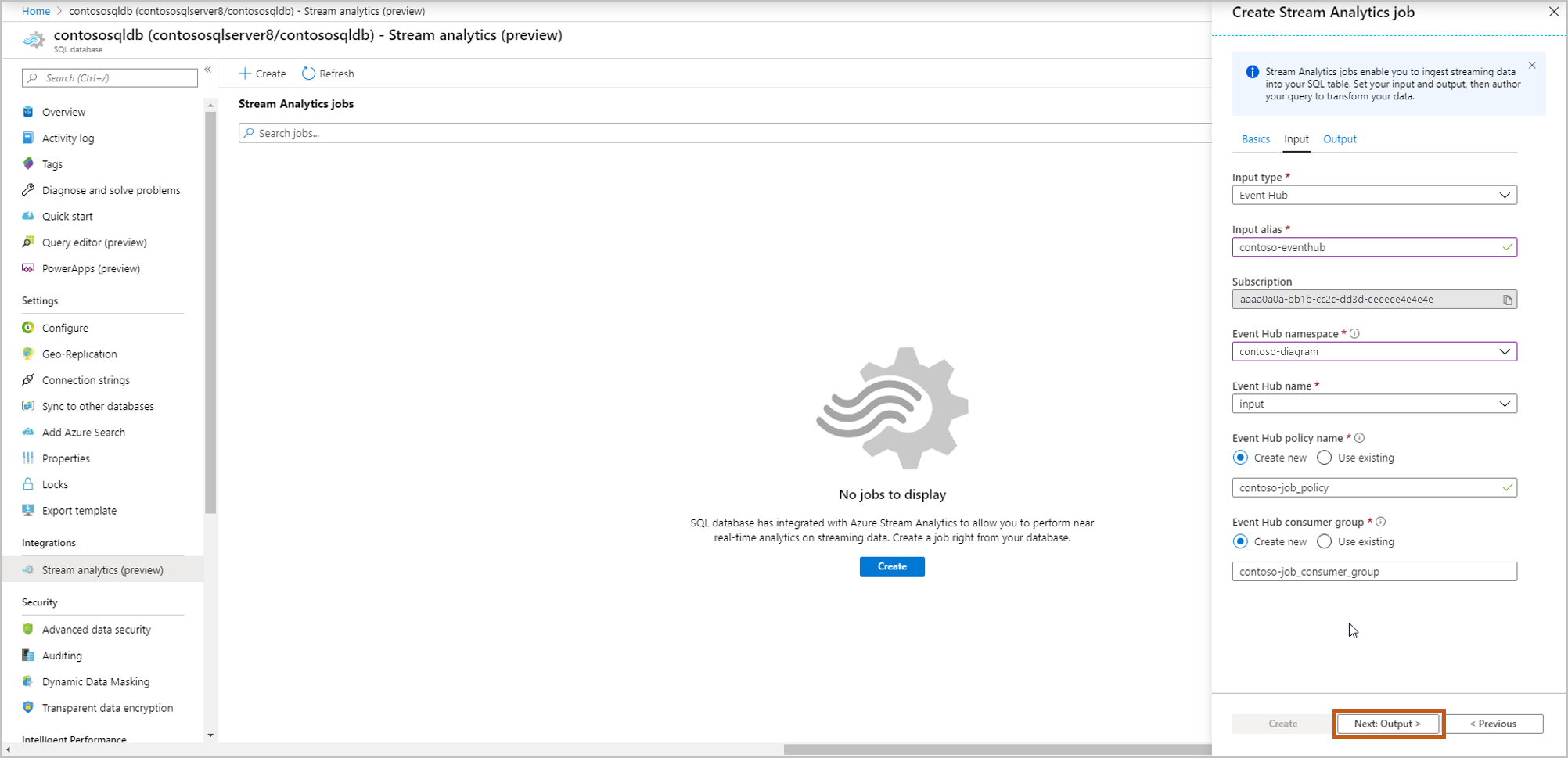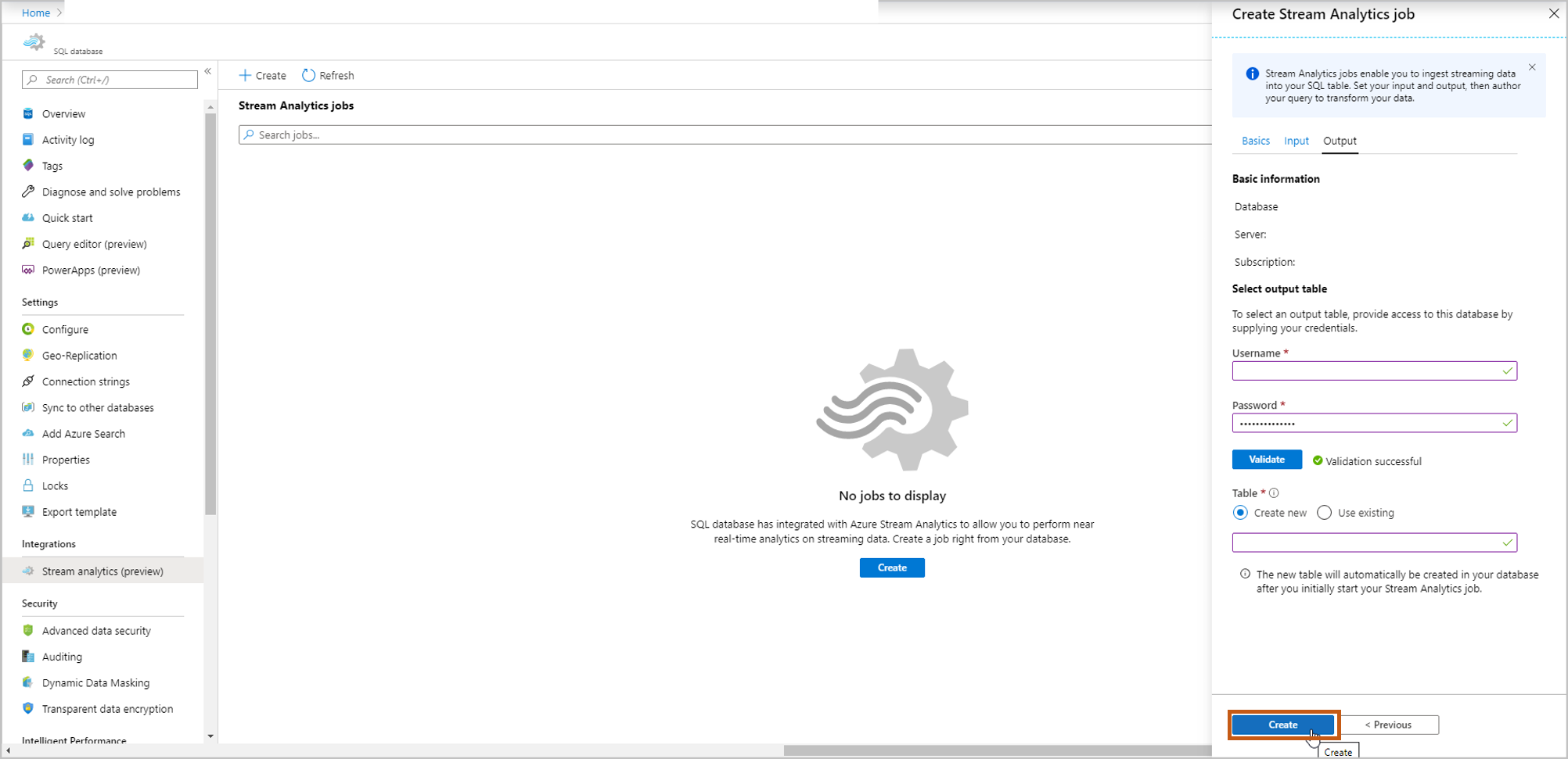 To start ingesting your streaming data into this database, select Create and give a name to your streaming job, and then select Next: Input.