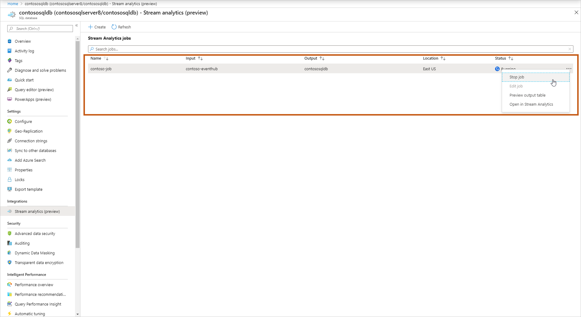 - Reduced number of steps: The context of your database and table is used to pre-configure a Stream Analytics job.