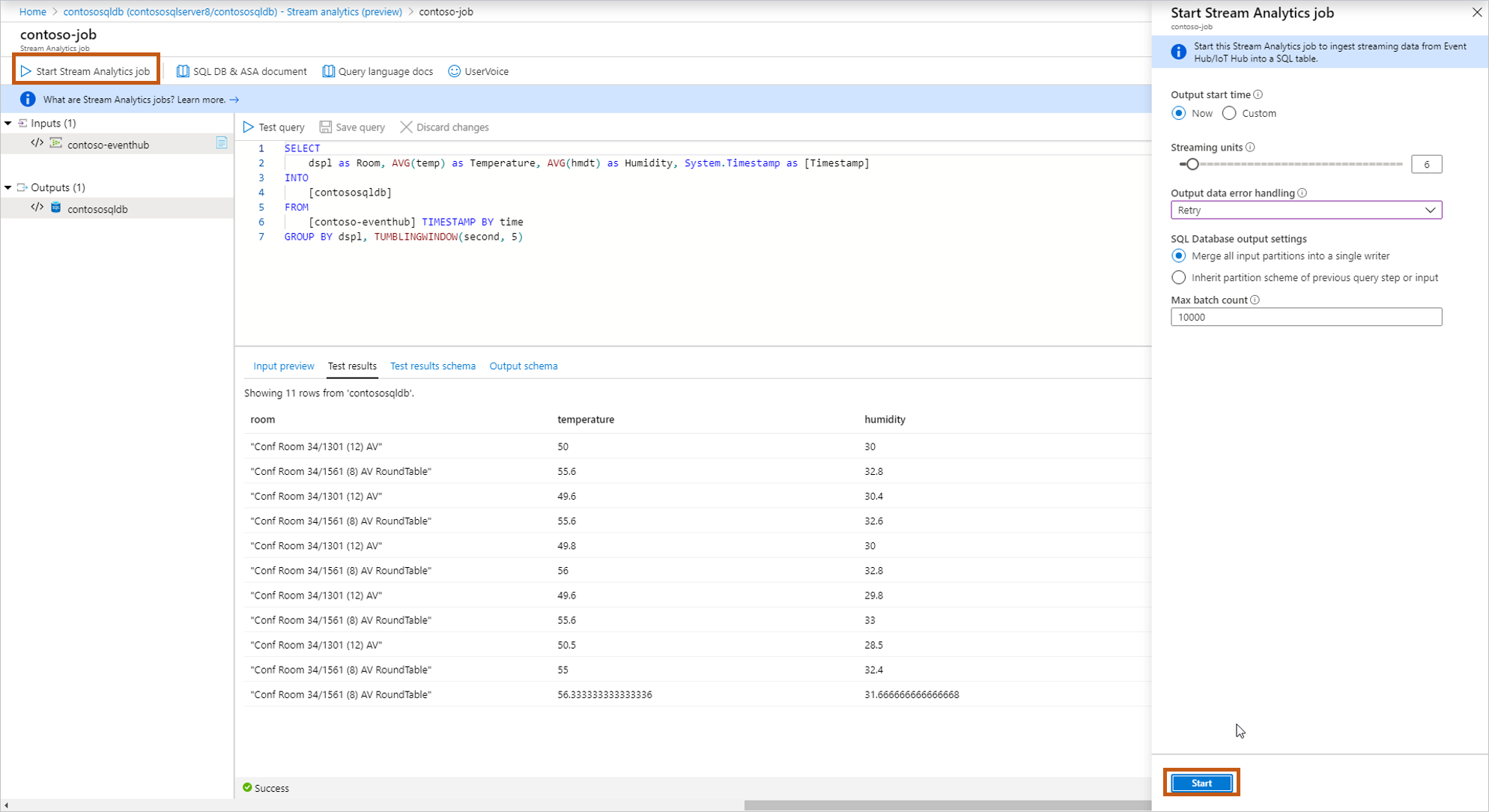 After you're done authoring & testing the query, select Save query. Select Start Stream Analytics job to start ingesting transformed data into the SQL table. Once you finalize the following fields, start the job.