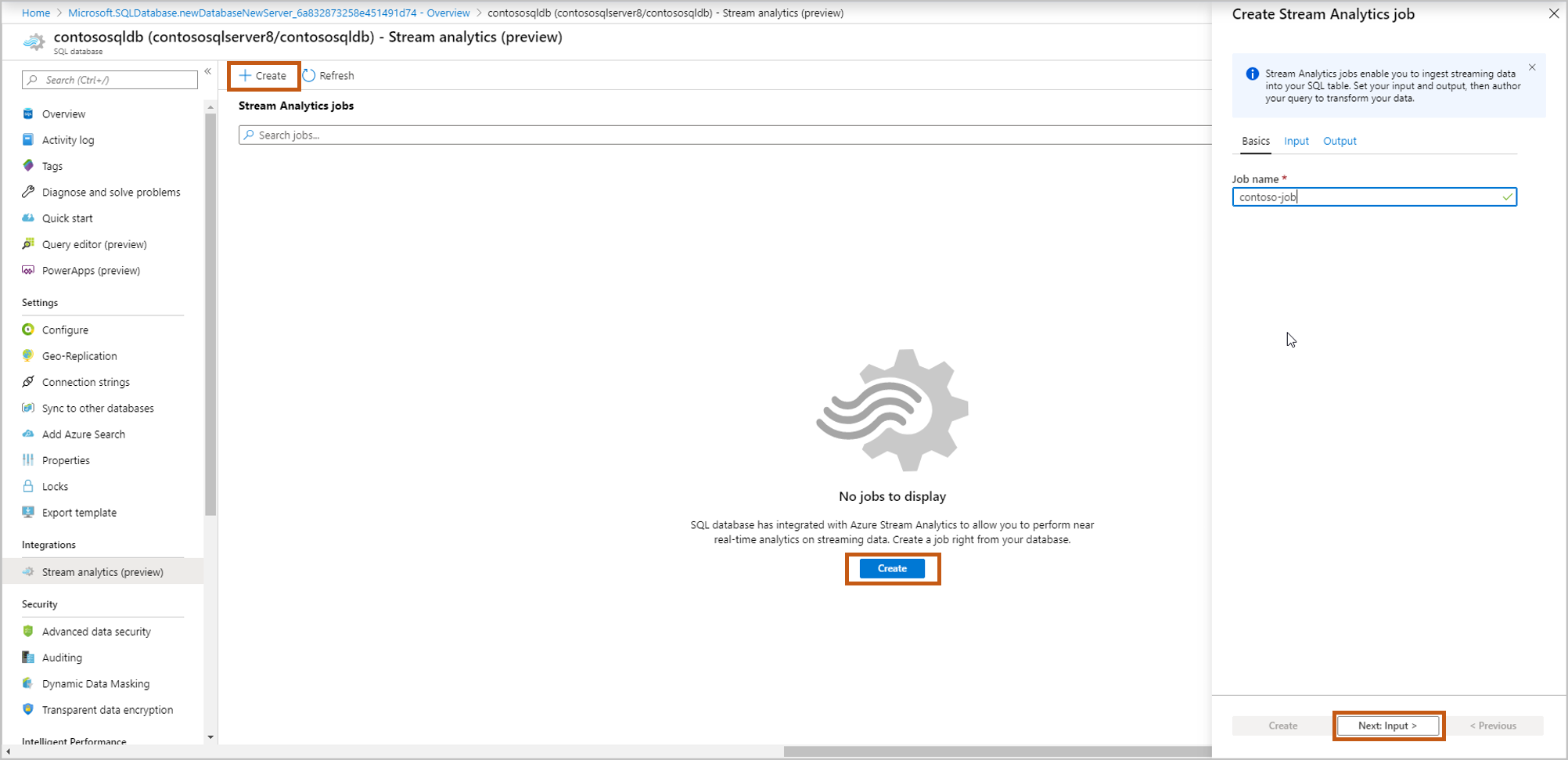 To start ingesting your streaming data into this database, select Create and give a name to your streaming job, and then select Next: Input.