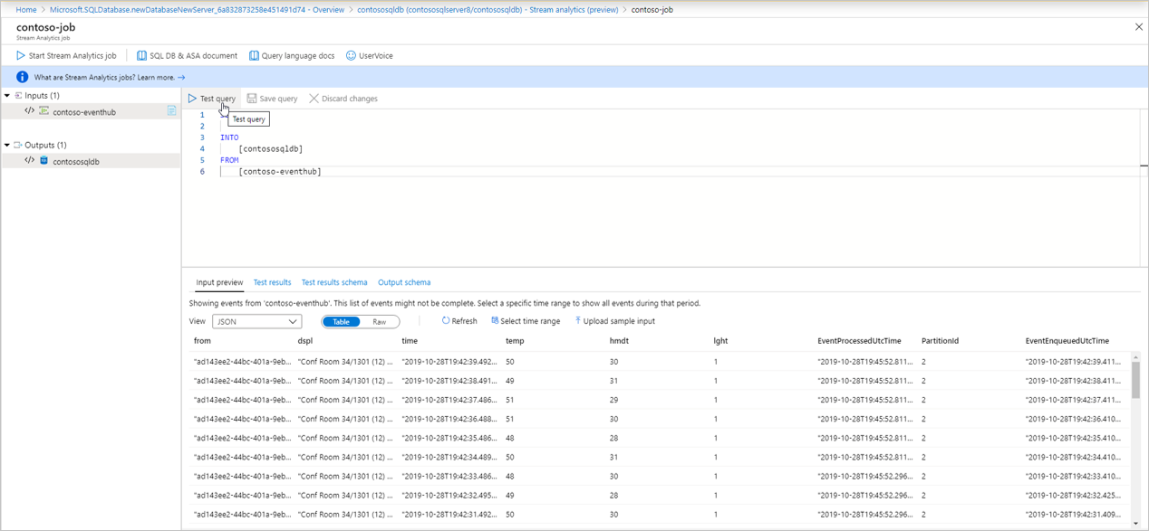 In the Azure portal, you can select an events source (Event Hub/IoT Hub), view incoming real-time events, and select a table to store events. You can also write Azure Stream Analytics Query Language queries in the portal to transform incoming events and store them in the selected table. This entry point is in addition to the creation and configuration experiences that already exist in Stream Analytics. This experience starts from the context of your database, enabling you to quickly set up a Stream Analytics job and navigate seamlessly between the database in Azure SQL Database and Stream Analytics experiences.