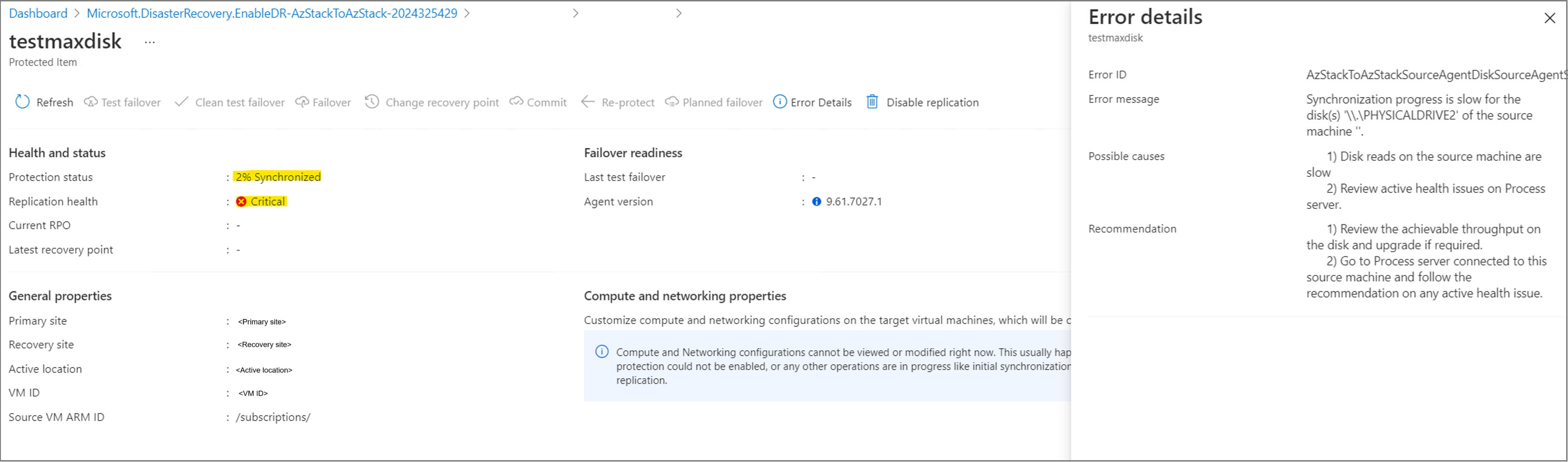 Replication is blocked at xx% Synchronized and after a while, the replication health becomes Critical with the error AzStackToAzStackSourceAgentDiskSourceAgentSlowResyncProgressOnPremToAzure. The error occurs because during replication, Site Recovery tries to resize the seed disk to 1,024 GB and write to it. This operation fails, as Azure Stack Hub doesn't support 1,024 GB disks.