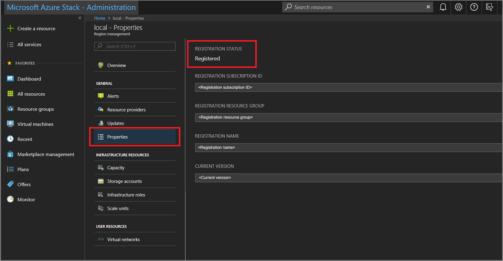 You can use the Region management tile to verify that the Azure Stack Hub registration was successful. This tile is available on the default dashboard in the administrator portal. The status can be registered, or not registered. If registered, it also shows the Azure subscription ID that you used to register your Azure Stack Hub along with the registration resource group and name.