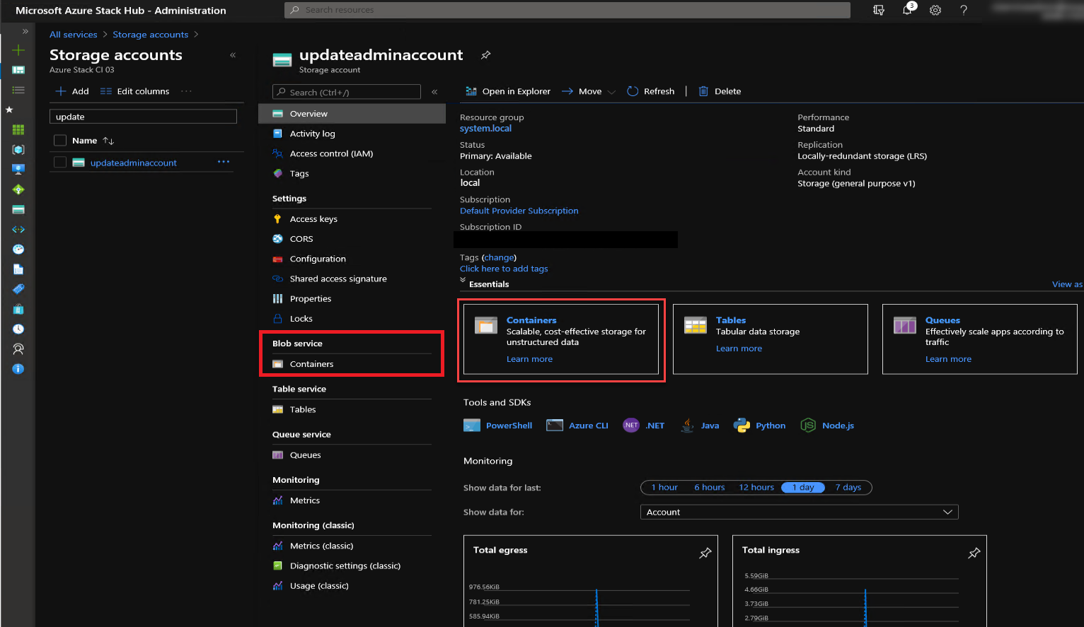 In the filter box, type update, and select the updateadminaccount storage account.