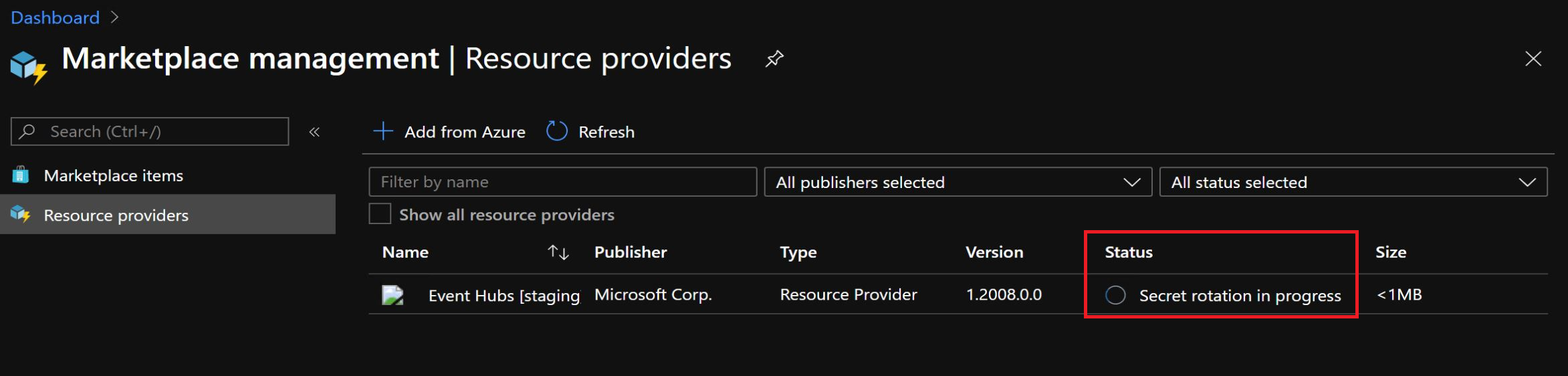 You can monitor secret rotation progress in either the PowerShell console, or in the administrator portal by selecting the resource provider in the Marketplace service: