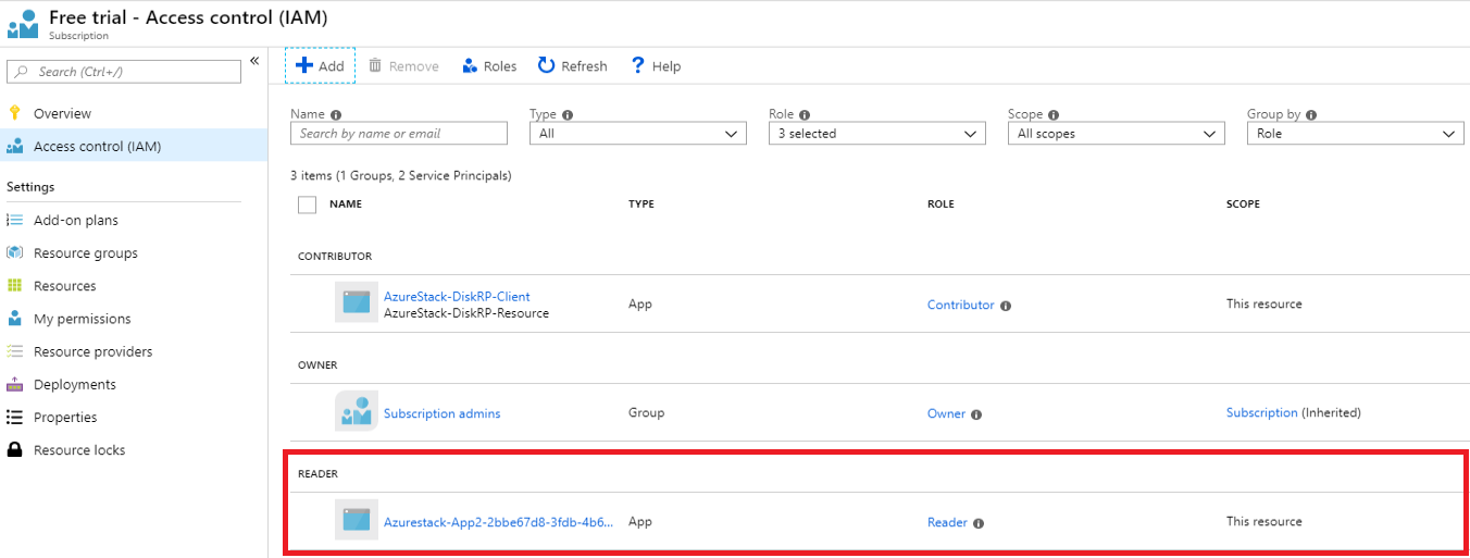 When finished, the app appears in the list of principals assigned for the current scope, for the given role.