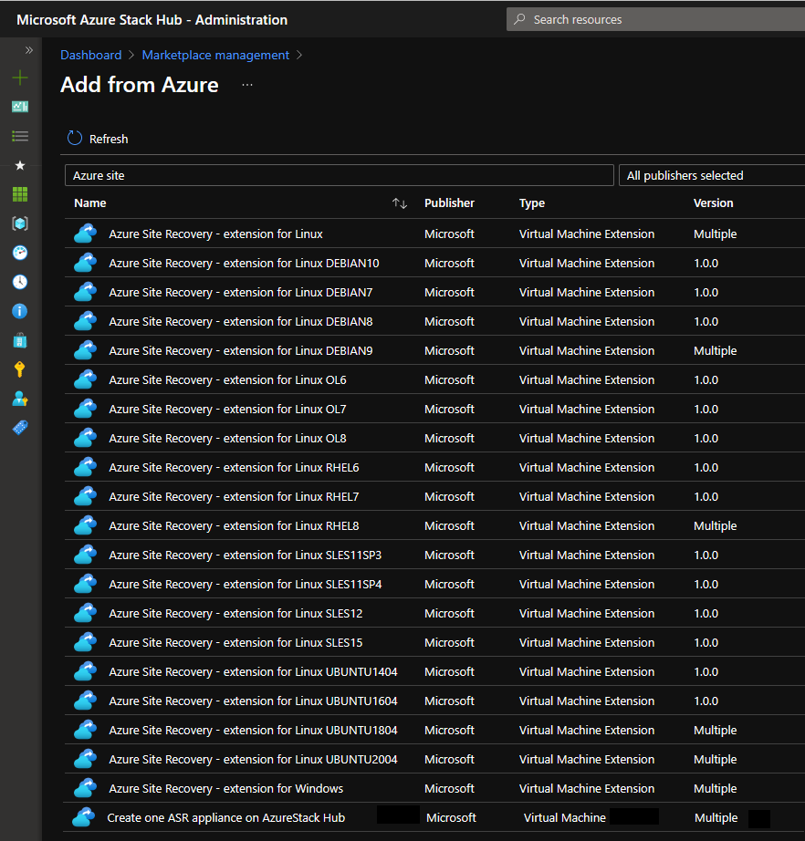 As an Azure Stack Hub operator, download the ASR appliance on AzureStack Hub VM image and the respective Azure Site Recovery - extensions in the Azure Stack Hub Marketplace Management.
