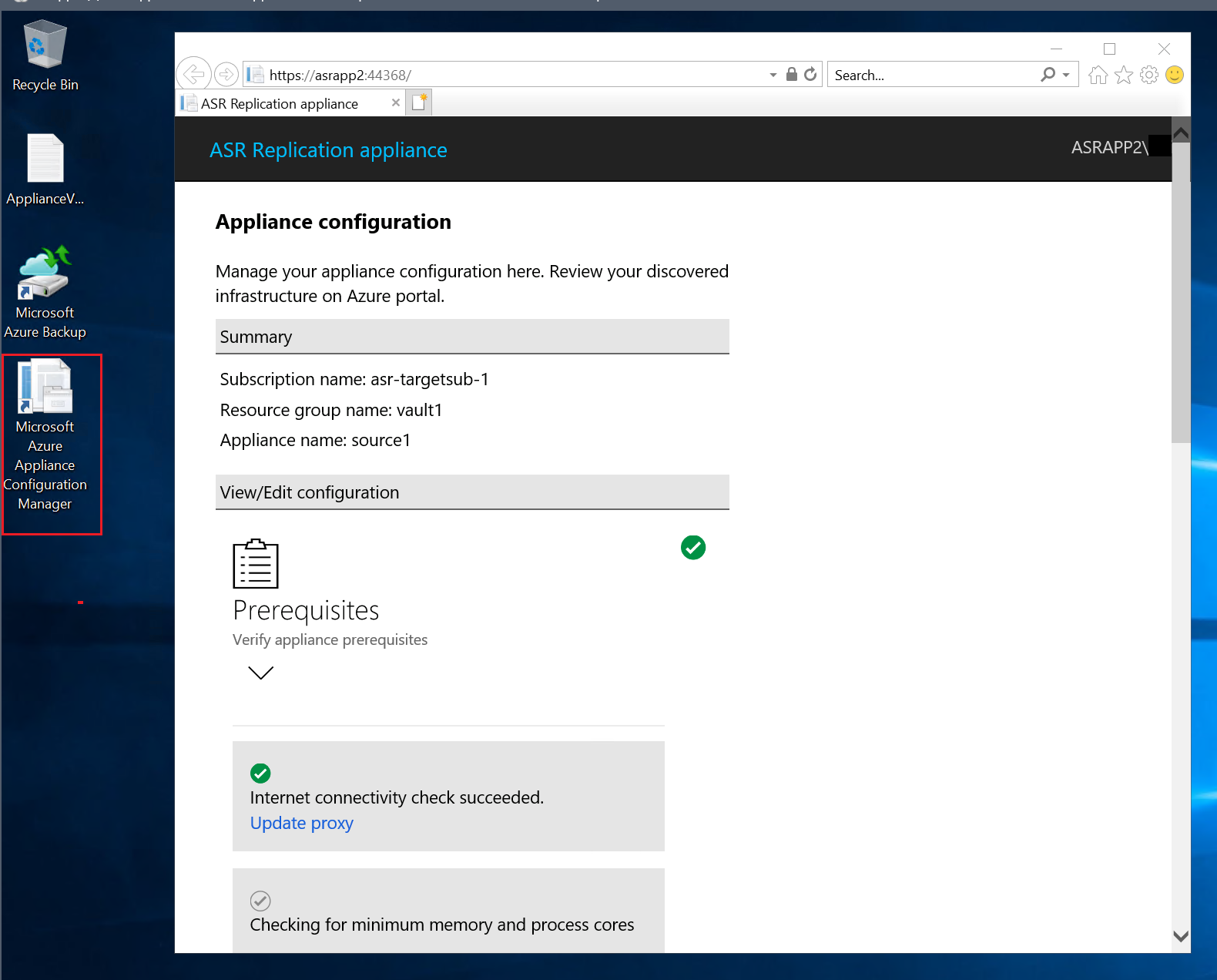 To start this process, open the Microsoft Azure Appliance Configuration Manager from the desktop of the Site Recovery appliance on Azure Stack Hub. Follow the wizard while using all the data from the vault connection properties, and the appliance is then configured.