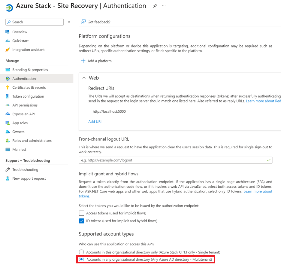 In the Azure portal, navigate to Microsoft Entra ID of the Azure Stack Hub home directory, and find the Application registration. In All applications, search for Azure Stack - Site Recovery or the APP ID identified in the previous step. Select the application and go to the Authentication section. Select Accounts in any organizational directory (Any Azure AD directory - Multitenant), then select Save.
