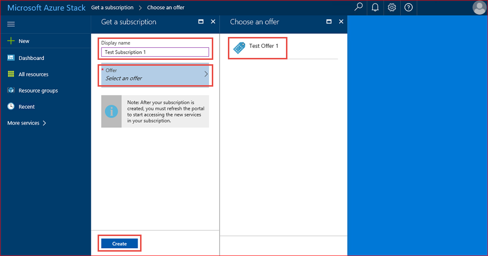 This tutorial shows how to create a subscription containing an offer and then how to test it. For the test, you sign in to the Azure Stack Hub user portal as a cloud admin, subscribe to the offer, and then create a virtual machine (VM).