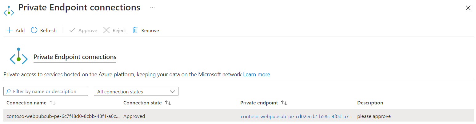 It takes a few minutes for the approval to be reflected in Web PubSub. You can check the state by using either the Azure portal or the Azure CLI.