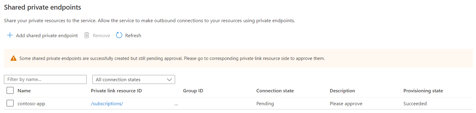 When the shared private endpoint connection has a Pending status, the connection request must be approved at the target resource.
