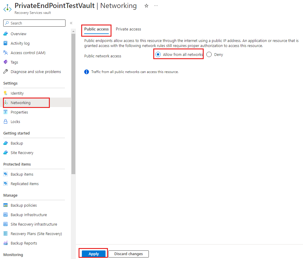After the private endpoint deletion is complete, go to the Vault > Settings > Networking > Public access, and then select Allow from all network and select apply.