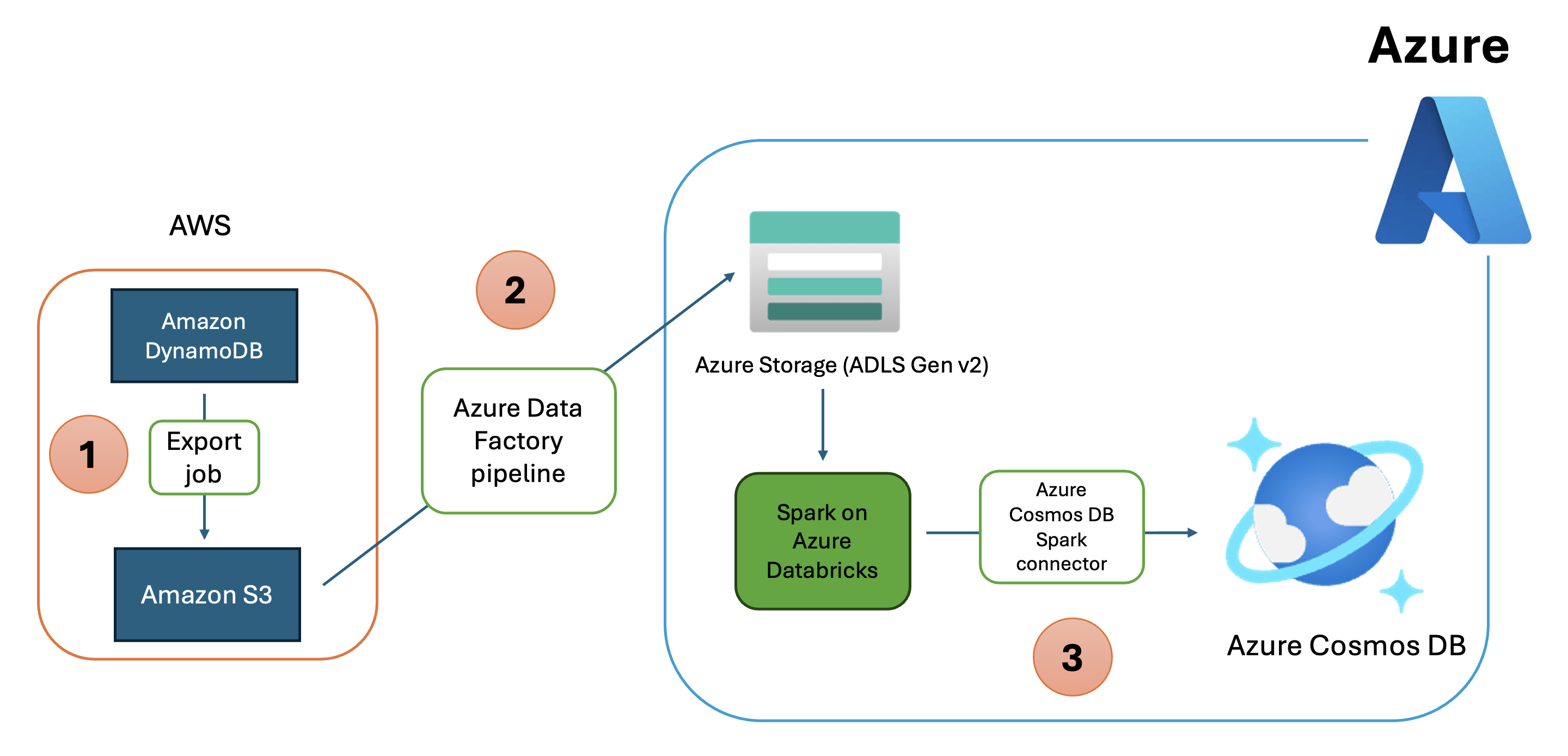 | Export from DynamoDB to S3, load to Azure Data Lake Storage Gen2 by using Azure Data Factory, and write to Azure Cosmos DB by using Spark on Azure Databricks. | Decouples storage and processing. Spark provides scalability and flexibility (additional data transformations, processing). | Multistage process increases complexity and overall latency. Requires knowledge of Spark. |