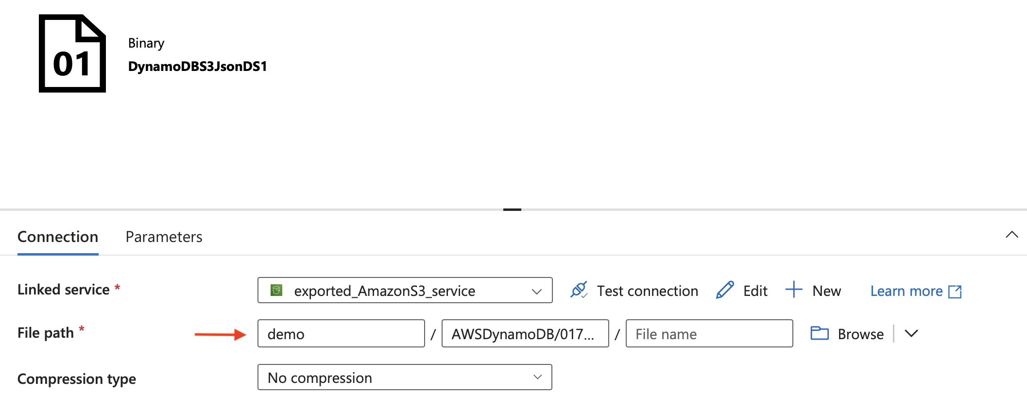 Create an Azure Data Factory linked service for Amazon S3. Enter the details for the S3 bucket to which you exported table data earlier.