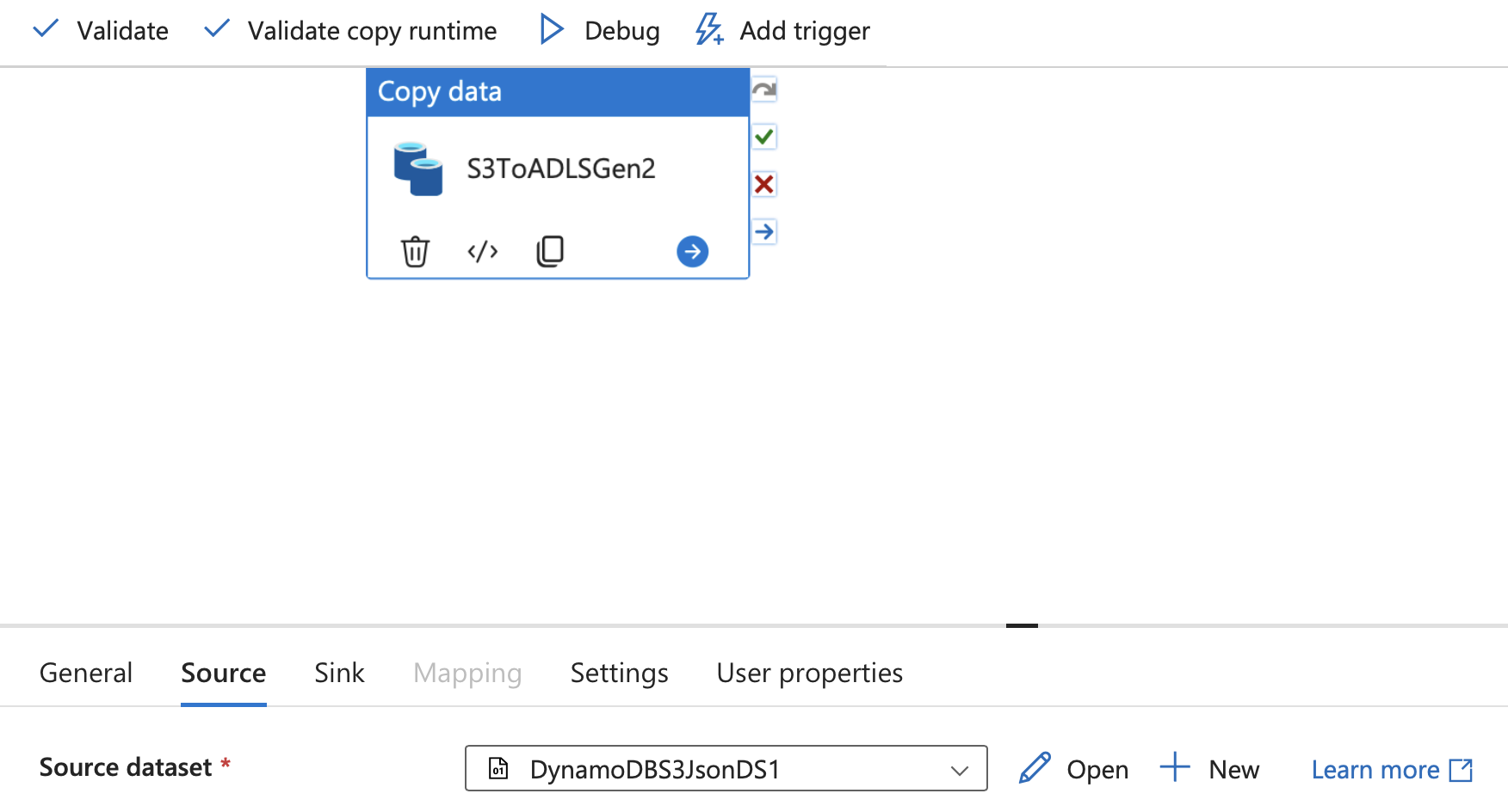 You can also edit the sink dataset to update the name of the storage container in which the data from S3 will be stored. The container is named