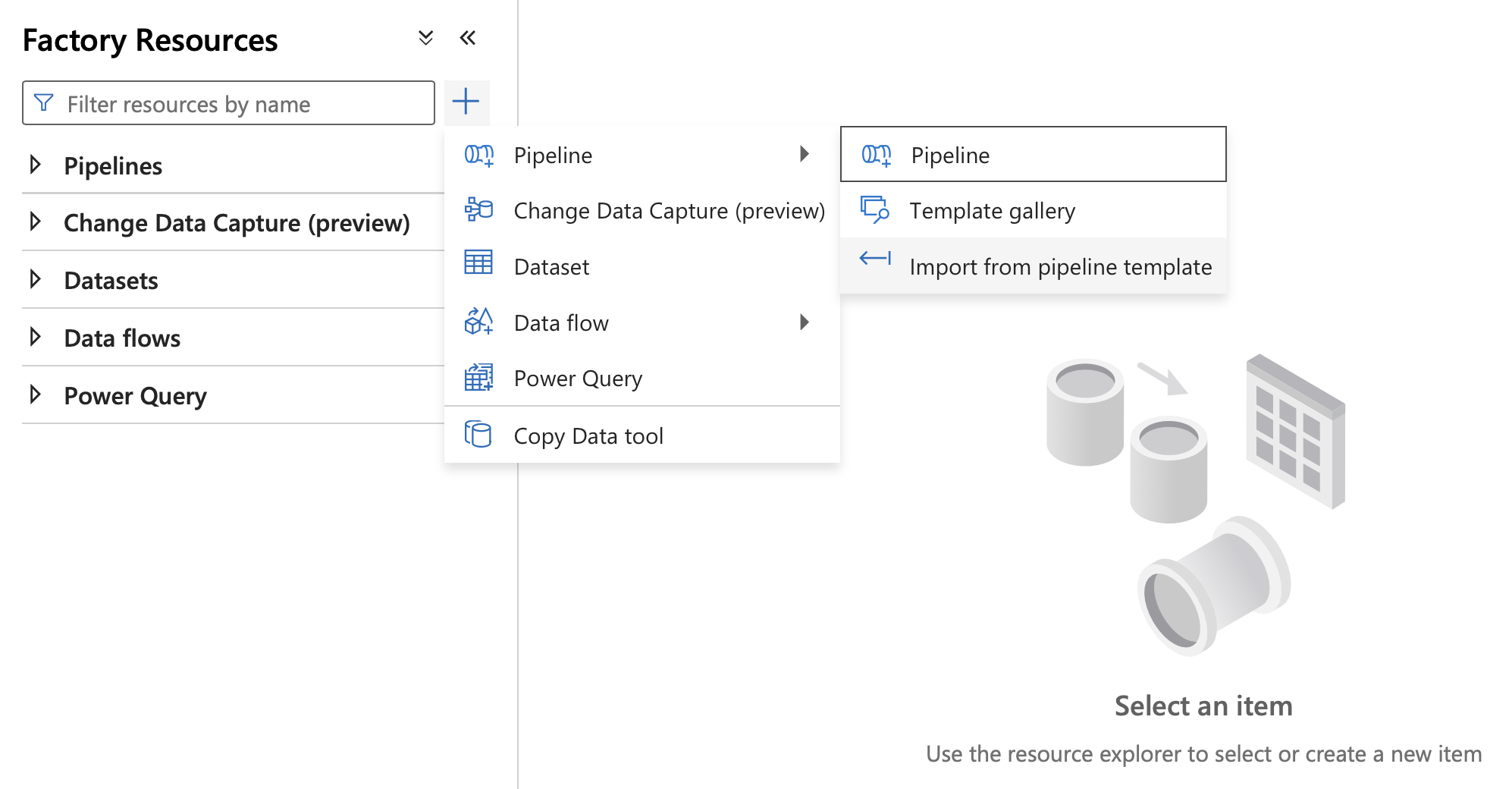 Select the plus sign. On the menu that appears, select Pipeline, and then select Import from pipeline template.