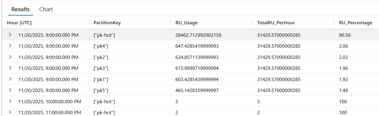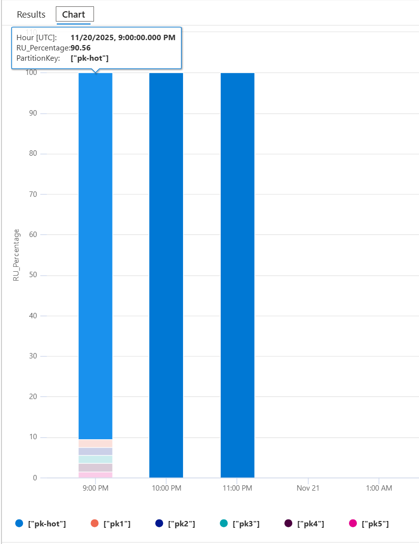 PartitionKeyRangeIdthat consistently shows higher normalized RU consumption than others. For example, if one value is always at 100 percent and others are at 30 percent or less, this pattern indicates a hot partition.