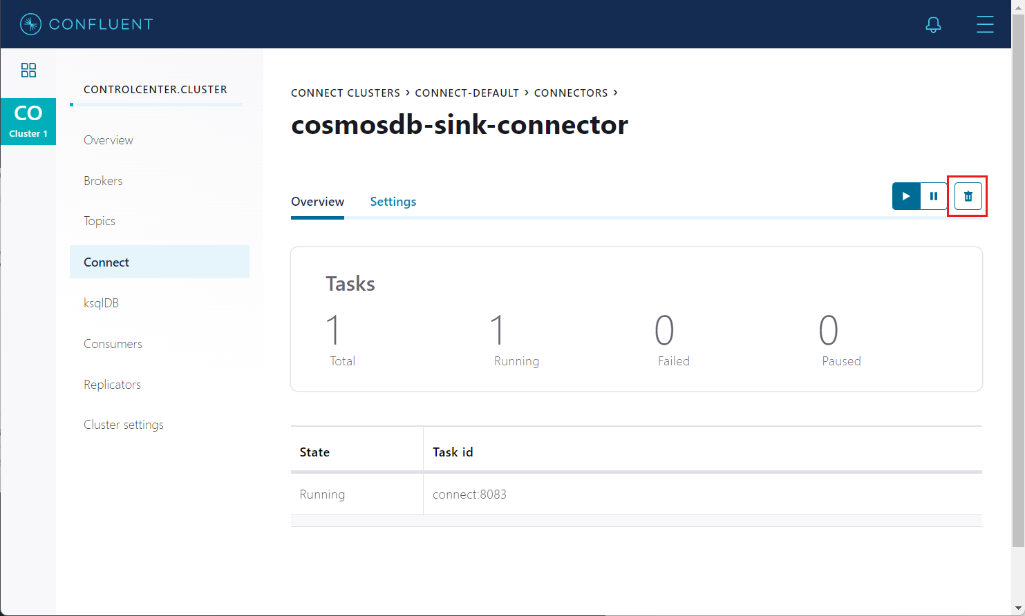 To delete the connector from the Control Center, navigate to the sink connector you created and select the Deletion icon.