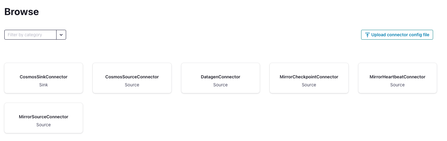 Alternatively, in the connectors page, you can upload the JSON file created earlier by using the Upload connector config file option.
