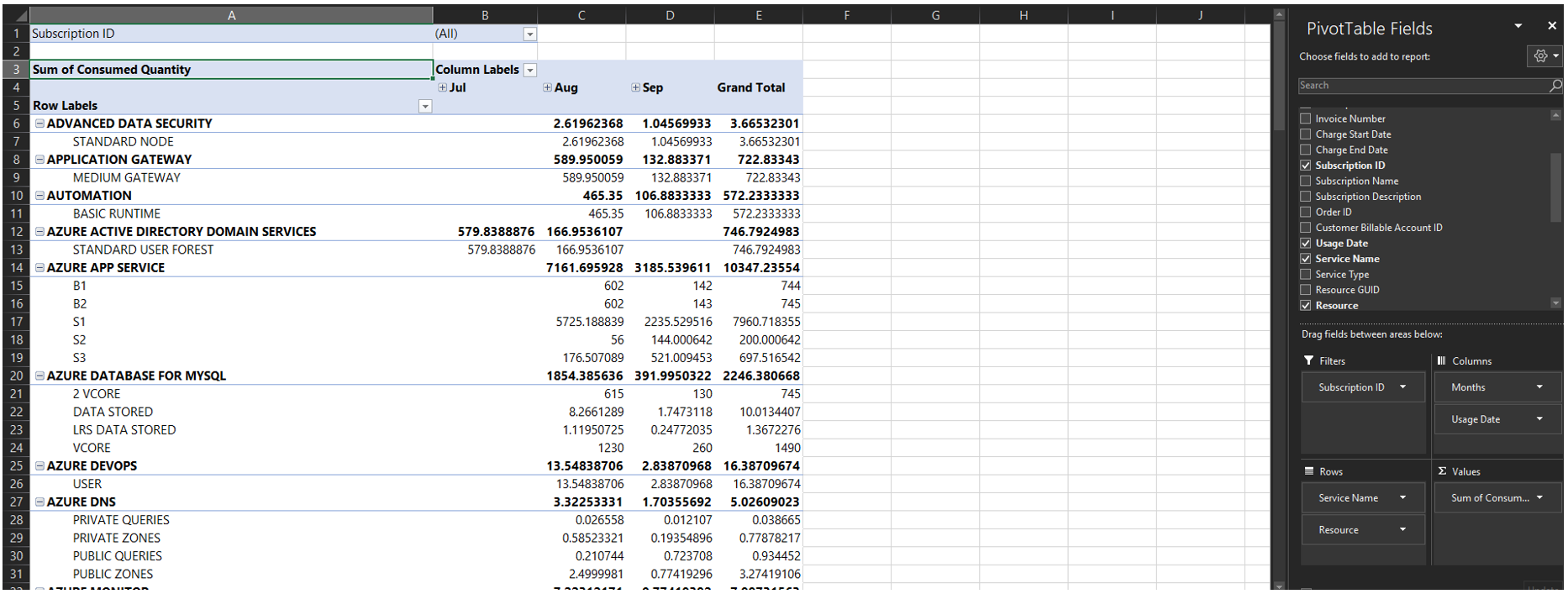 - Now you have a dashboard for generalized consumption investigation. You can filter for a specific service using the filtering options in the pivot table.
