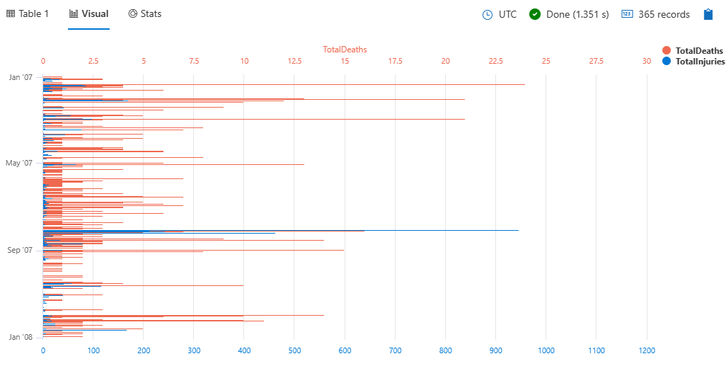 The following query provides a daily summary of storm-related injuries and deaths, visualized as a bar chart with split axes/panels for better comparison.