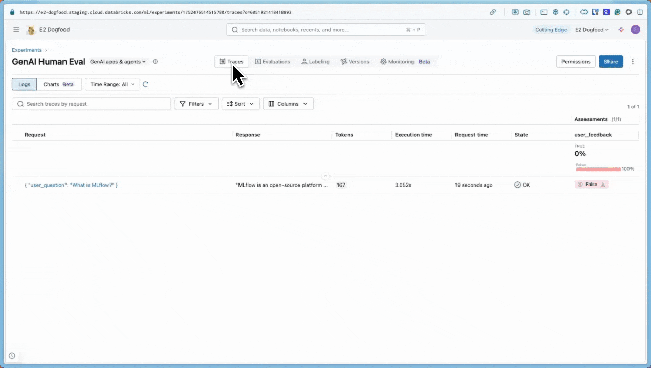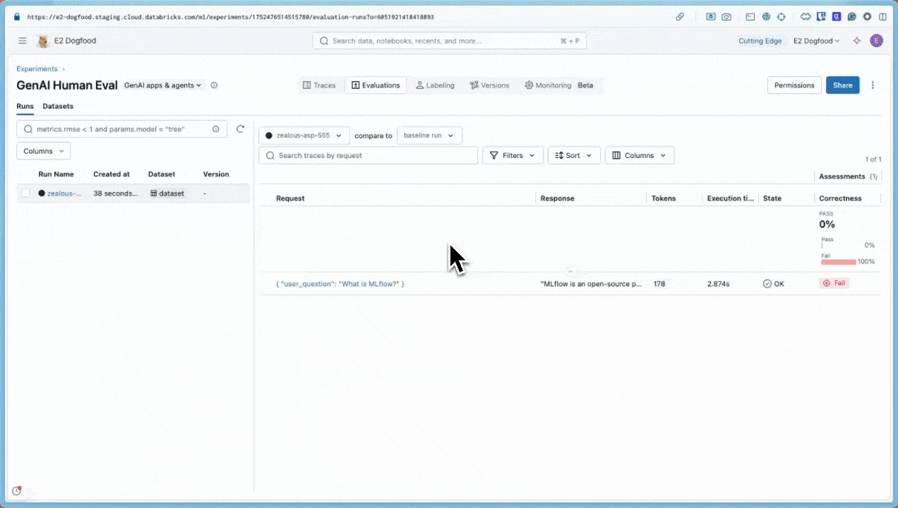 expected_responseto the question "What is MLflow?":MLflow is an open-source platform for managing the machine learning lifecycle, including experiment tracking, model registry, packaging, deployment, and evaluation. It supports classical ML, deep learning, and generative AI workflows. On Databricks, MLflow provides managed, secure, and scalable integration for easy collaboration and governanceSubmit their expert assessments as ground truth.