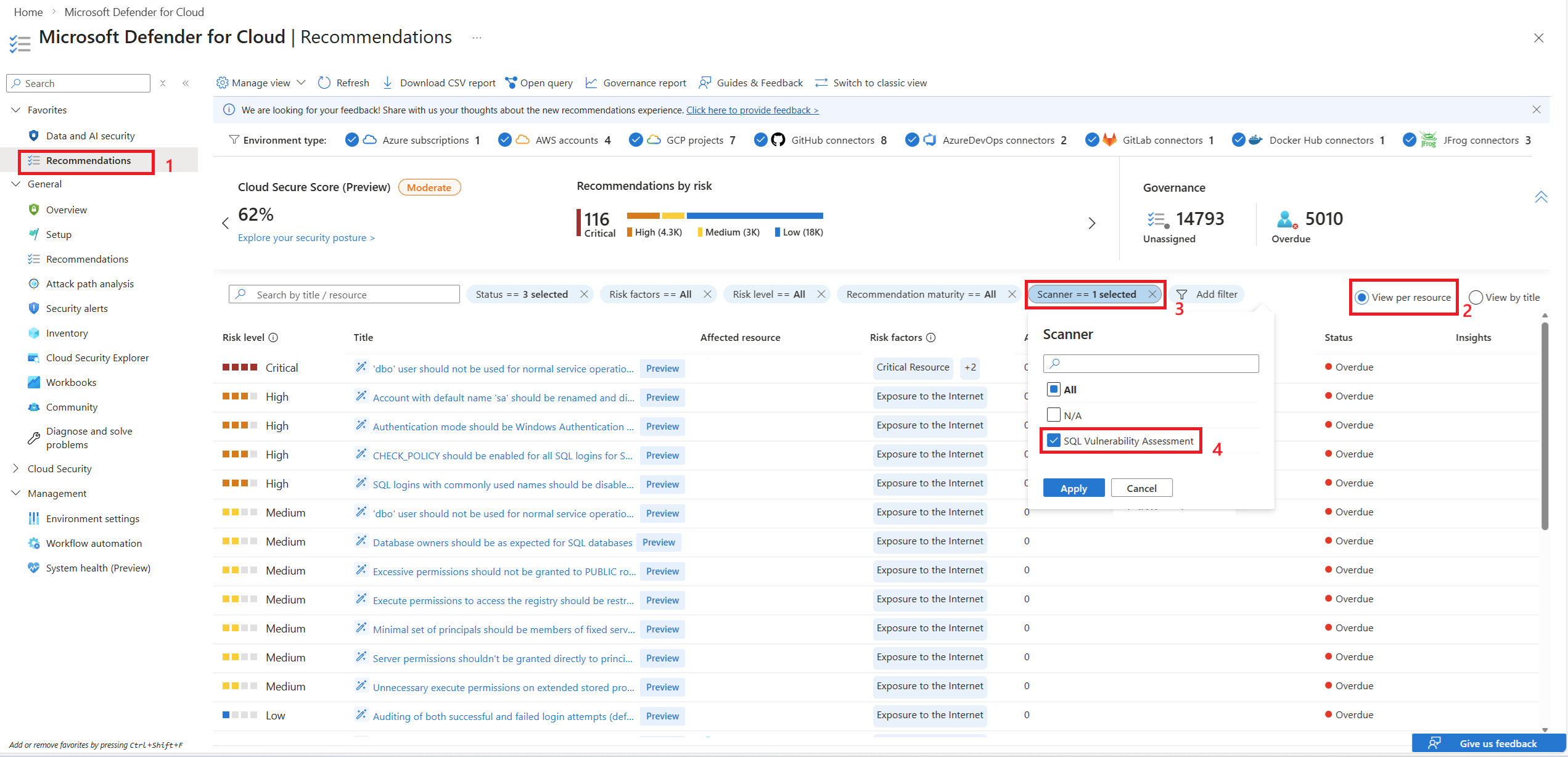 - Recommendations are associated directly with the affected SQL database resource.