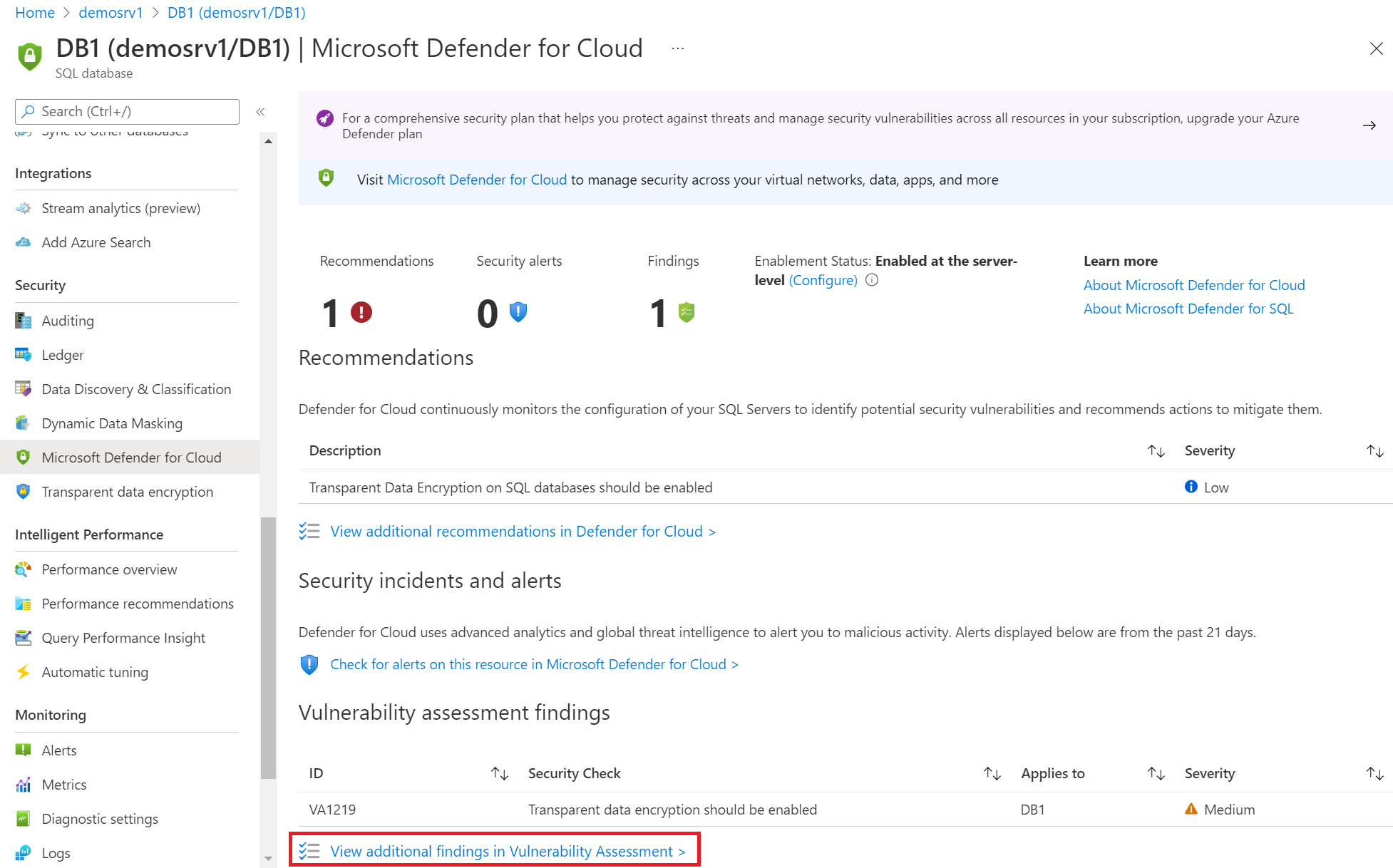 Microsoft Defender for Cloud provides SQL vulnerability assessment for your Azure SQL databases. SQL vulnerability assessment scans your databases for software vulnerabilities and provides a list of findings. Use the findings to fix software vulnerabilities and disable findings.