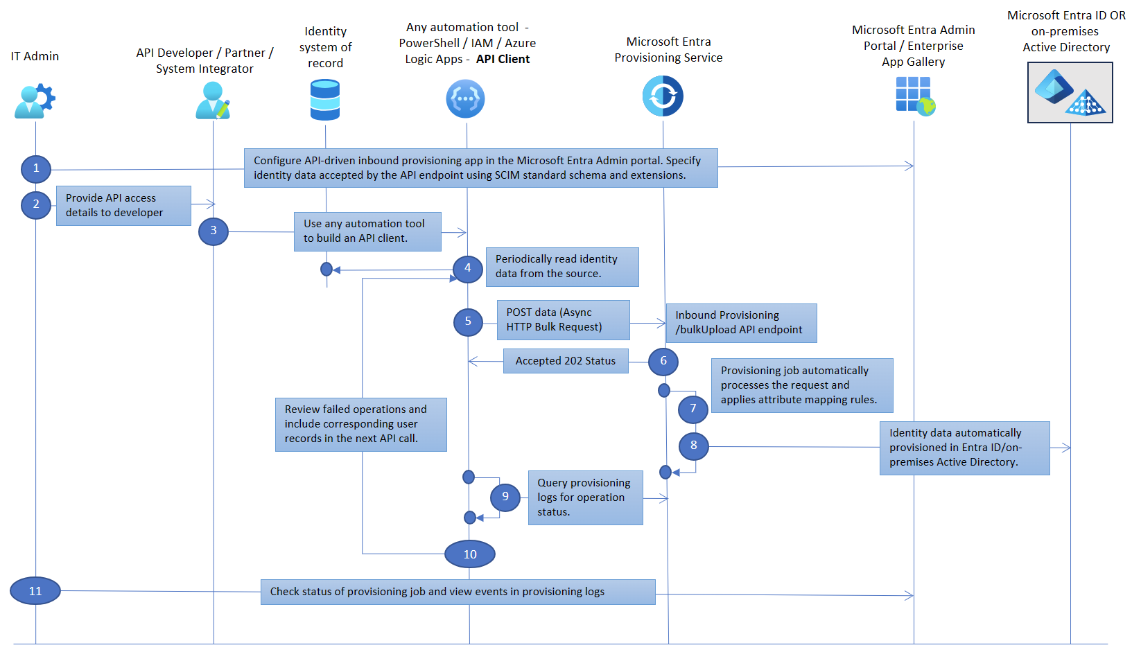 - The API developer/partner/system integrator builds an API client to send authoritative identity data to Microsoft Entra ID.
