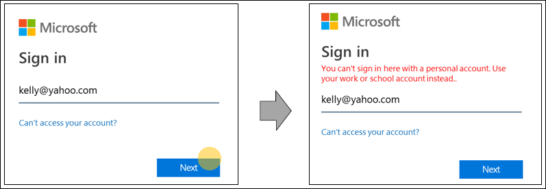 Another benefit of this work is improved error messaging. Here are some examples of the improved error messaging when signing in to an application that supports Microsoft Entra users only.