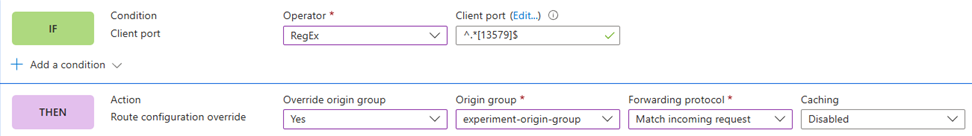 For example, you can split incoming traffic based on the client port number. A rule can match client ports that end in 1, 3, 5, 7, or 9 and forward those requests to an experiment-origin-group. All other traffic continues to the default origin group per route settings. The previous regex is just an example. You can explore and test your own expressions using tools like regex101.
