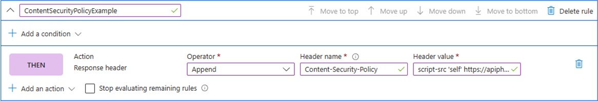 For example, you can add a Content-Security-Policy header to all incoming requests that match the path defined in the route associated with your rules engine configuration. In this configuration, use script-src 'self' https://apiphany.portal.azure-api.cn as the header value to only allow scripts from the trusted site https://apiphany.portal.azure-api.cn to run on the application. For more information, see Add security headers with rules engine.