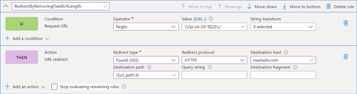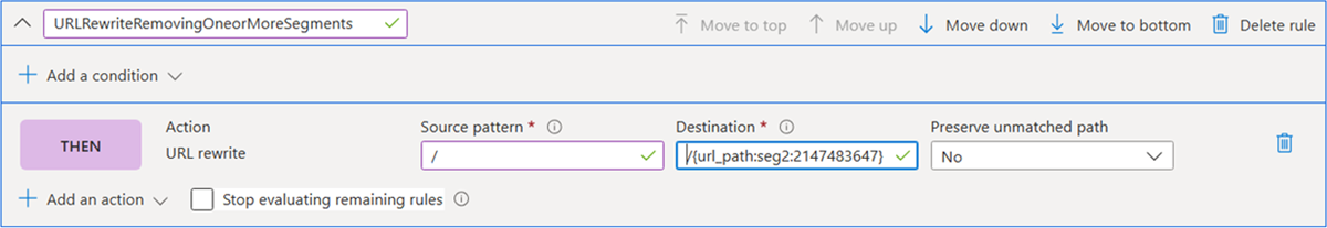 Similar configuration can be done for URL rewrite action by inputting source pattern as / and destination as /“{url_path:3} for redirect action as shown in the following portal example.