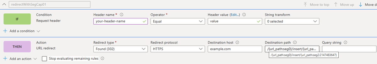 For example, if you want to redirect https://domain.com/seg0/seg1/seg2/seg3 to https://example.com/seg0/insert/seg2/seg3. In this scenario, you replace URL path’s {seg1} with /insert/ while preserving the rest of the URL path. Azure Front Door achieves the desired redirect by combining values extracted from server variables (URL segments) and combining static string segment /insert/. You can use Int32.Max (2147483647) for URL segment’s length field to keep all segments from seg2 to segn. For more information, see Server variable format.