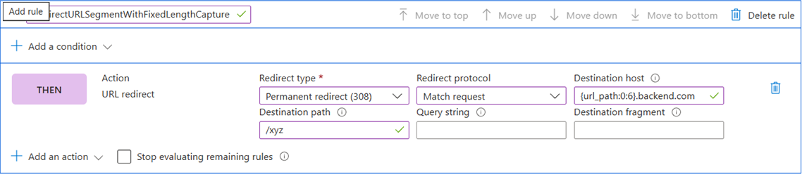 https://api.contoso.com/{tenantId}/xyz, you can extract{tenantId}from the URL and decide the correct redirect in the format oftenantId.backend.com/xyzwith server variable{url_path:seg0}.backend.comin the redirect destination host.This method avoids creating separate rules for each tenant ID, enabling more efficient configuration.