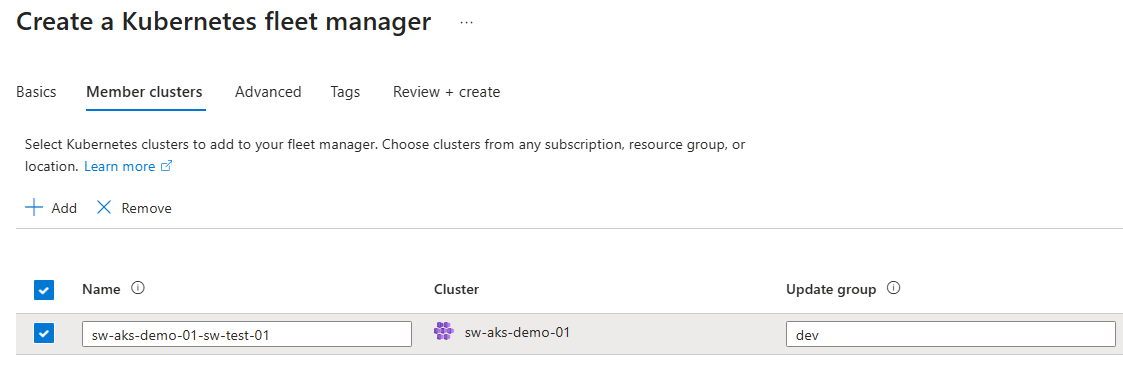 - Enter an update group for the member cluster so the cluster can be safely updated when the group is included in a Fleet Manager update strategy.