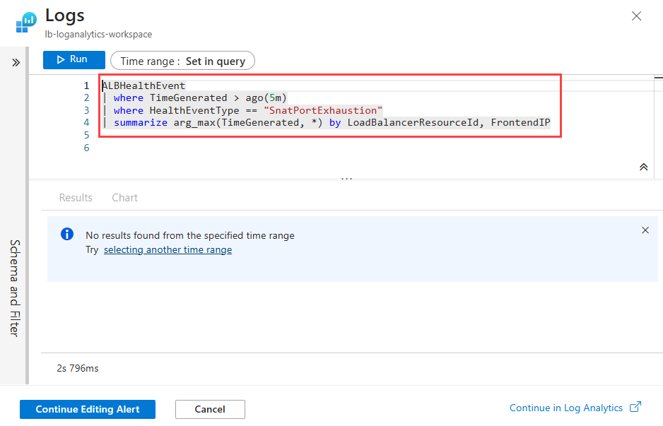 From the results, select Load to editor under Latest SNAT Port Exhaustion per LB Frontend.