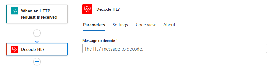 Parameter Required Value Description Message to decode Yes <message-to-decode> The HL7 message content to decode. For example: