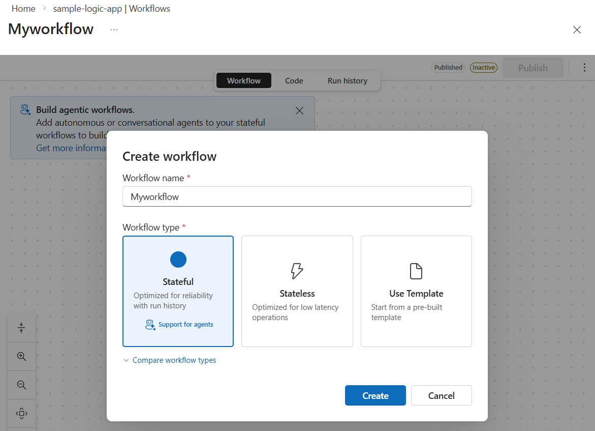Workflow type Description Autonomous agents Stateful workflows that use AI agents to complete tasks. They can start with any trigger, such as an event, schedule, or API call. Conversational agents Stateful workflows that use AI agents to complete tasks through chat interactions. Stateful Workflows that include run history. You can add agents to build intelligent automation integrations. Stateless Workflows that don't include run history. Optimized for speed and ideal for request-response and processing IoT events. When you're done, select Create.