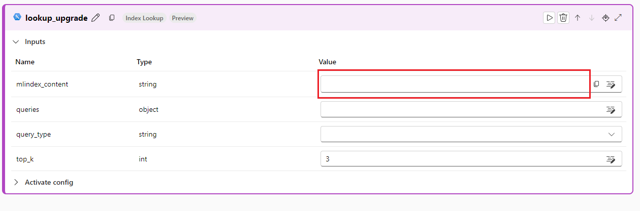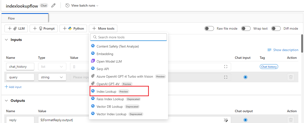 The Index Lookup tool looks to replace the three deprecated legacy index tools, the Vector Index Lookup tool, the Vector DB Lookup tool and the Faiss Index Lookup tool. If you have a flow that contains one of these tools, follow the steps below to upgrade your flow.